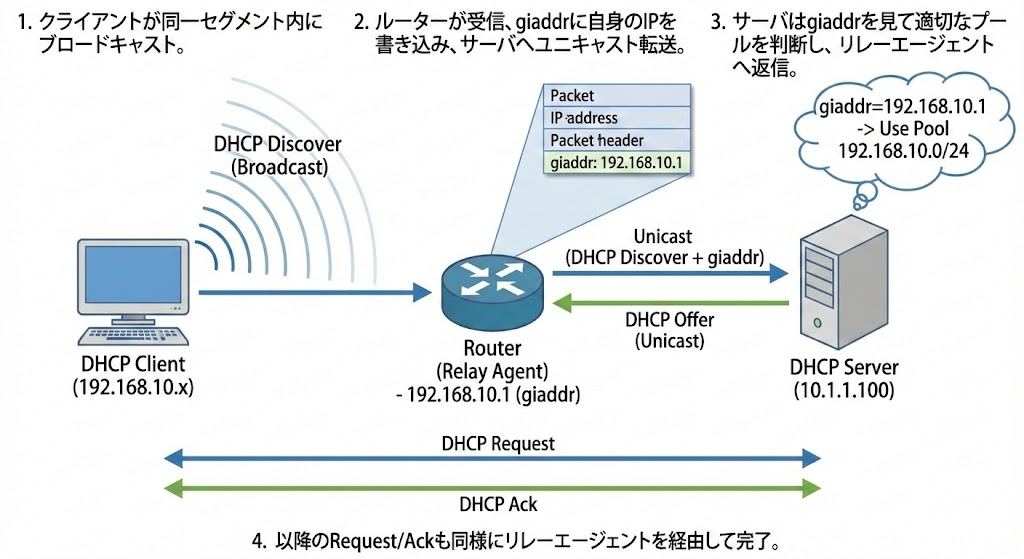 - 以降のRequest/Ack: 同様にリレーエージェントを経由して通信が完了します。