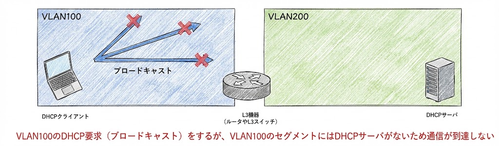 通常、PCなどのDHCPクライアントは、自身のIPアドレスを決めるために「ブロードキャスト」でサーバを探します。しかし、ブロードキャストはルーター(L3デバイス)を越えることができません。