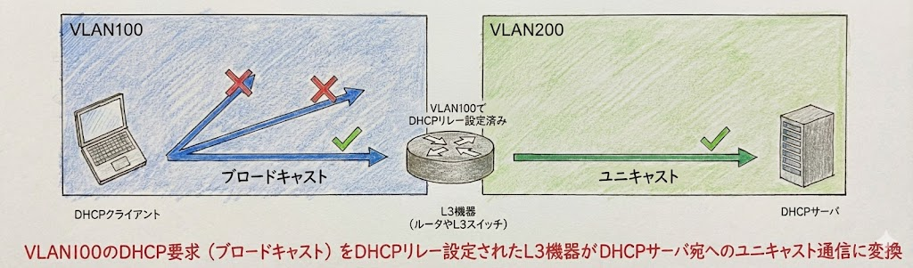 ここでクライアントからのブロードキャストを別のネットワークのDHCPサーバ宛へのユニキャスト通信に変換する仕組みのことをDHCPリレーと言います。