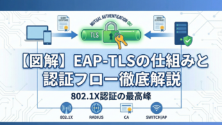802.1X認証で最強のセキュリティを誇る「EAP-TLS」の仕組みと認証フローを、NWエンジニア向けに図解で徹底解説。EAP-PEAPとの違いや、実務で必須となる証明書を用いた相互認証のシーケンス、導入要件まで分かりやすく網羅しています。